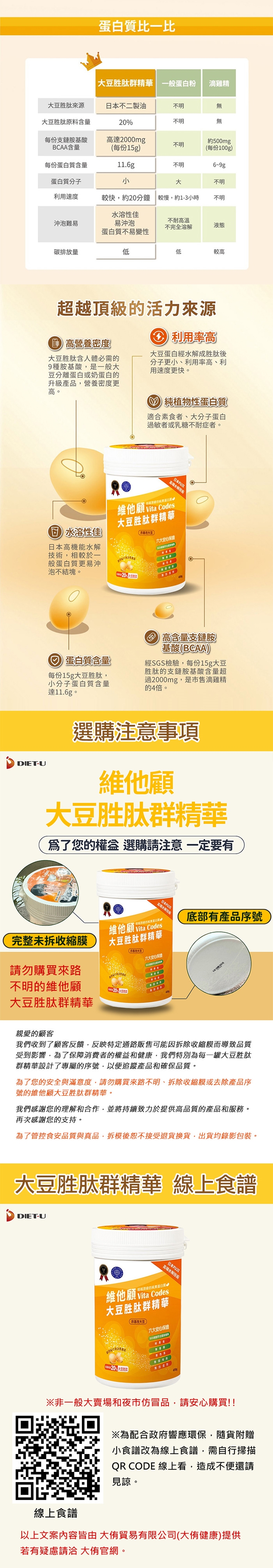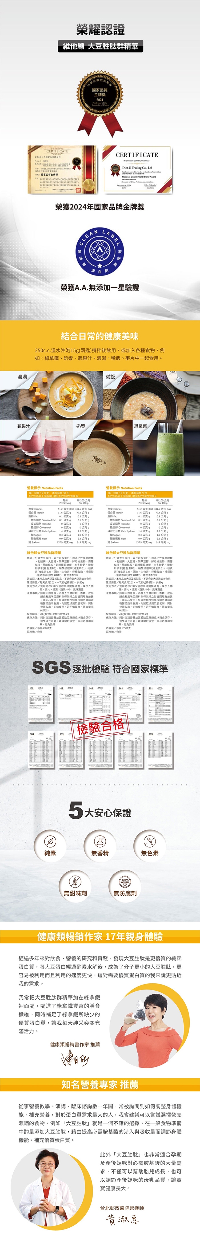 ●成份:分離大豆蛋白、大豆水解蛋白(大豆胜肽)、難消化性麥芽糊精(水溶性膳食纖維)、乳酸鈣、大豆粉、關華豆膠、酵母抽出物、麥芽糊精、菸鹼醯胺、本多酸鈣、葉酸、葡萄糖、生物素、維生素 B12、維生素 B6、維生素 B1、維生素B2、檸檬酸鐵、偏磷酸鈉、維生素 A