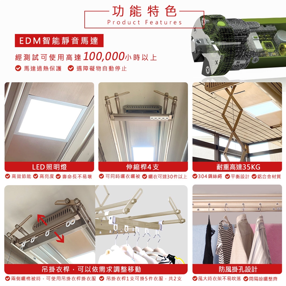 ◆EDM智能靜音馬達科技,下降遇障礙物將自動停止、電機過熱保護等安全裝置,馬達經測試可使用高達100000小時以上,運行安靜穩定且安全。