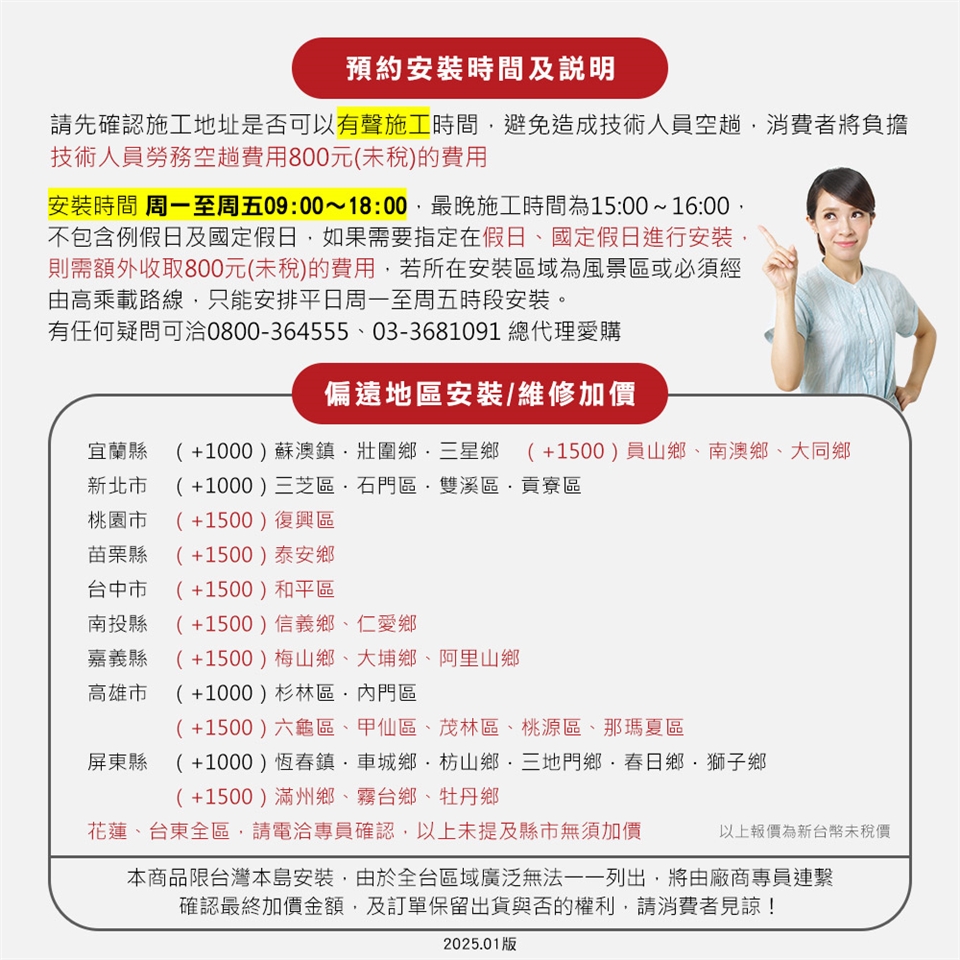 ※本商品採預約方式出貨(直接由生產廠商出貨安裝),訂單成立後 3 個工作天內會與客戶聯繫約定日期(不含週六日及國定假日)。