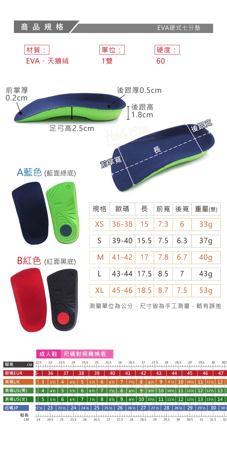 前掌厚0.2cm 後跟厚0.5cm 足弓高2.5cm 後跟高1.8cm