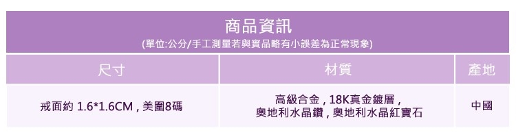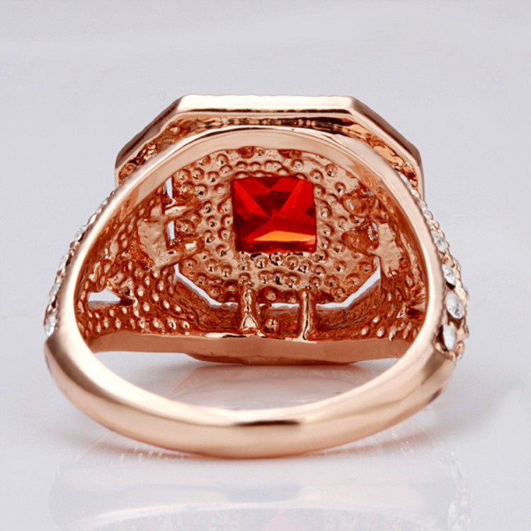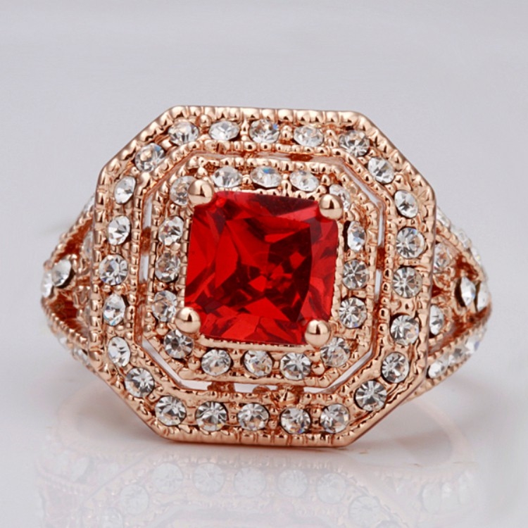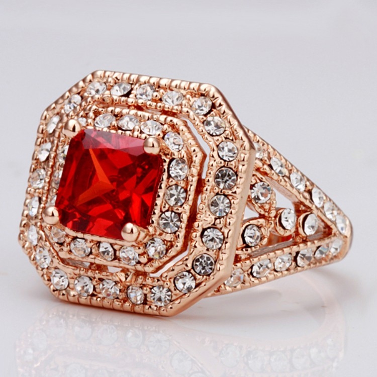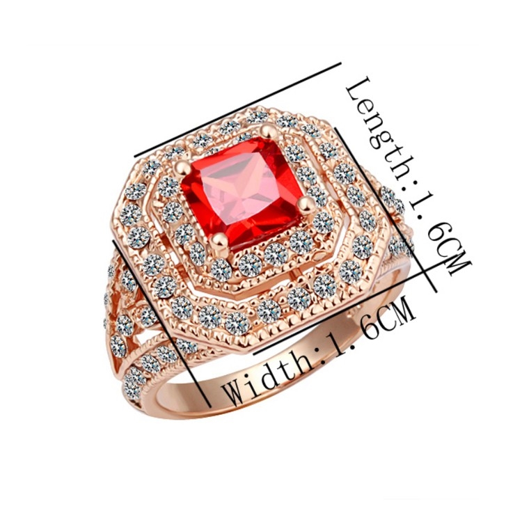 【Aphrodite 愛芙晶鑽】華貴方型排鑽紅寶石造型鑲鑽戒指(玫瑰金色)