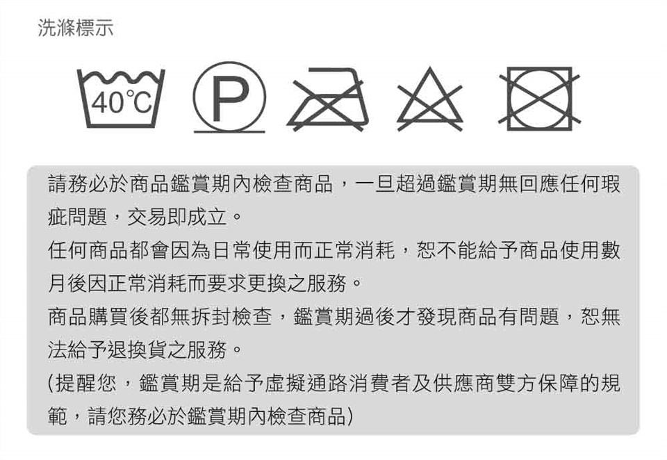 任何商品都會因為日常使用而正常消耗.恕不能給予商品使用數月後因正常消耗而要求更換之服務. 商品購買後都無拆封檢查.鑑賞期過後才發現商品有問題.恕無法給予退換貨之服務. (提醒您.鑑賞期是給予虛擬通路消費者及供應商雙方保障的規範.請您務必於鑑賞期內檢查商品)