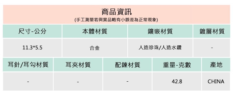 ◆合金飾品一經使用可能隨時間失去光澤或褪色,此為正常物理現象,妥善使用保存可延長飾品壽命。