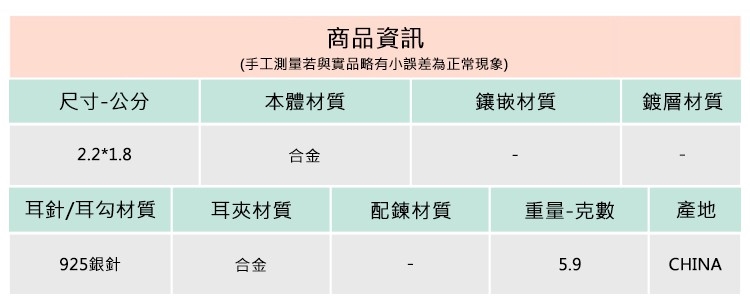 ◆合金飾品一經使用可能隨時間失去光澤或褪色,此為正常物理現象,妥善使用保存可延長飾品壽命。