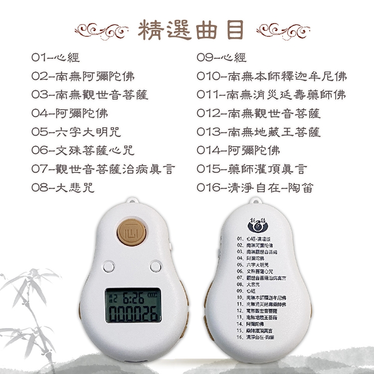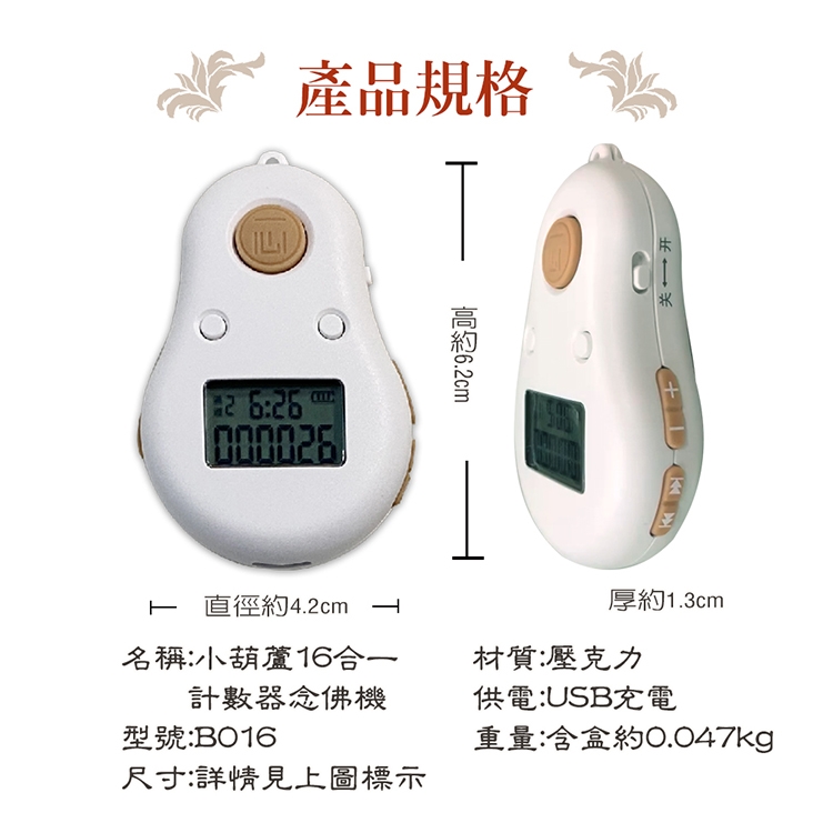 本產品為小葫蘆16合一計數器念佛機,配合多種佛經聖號唱誦