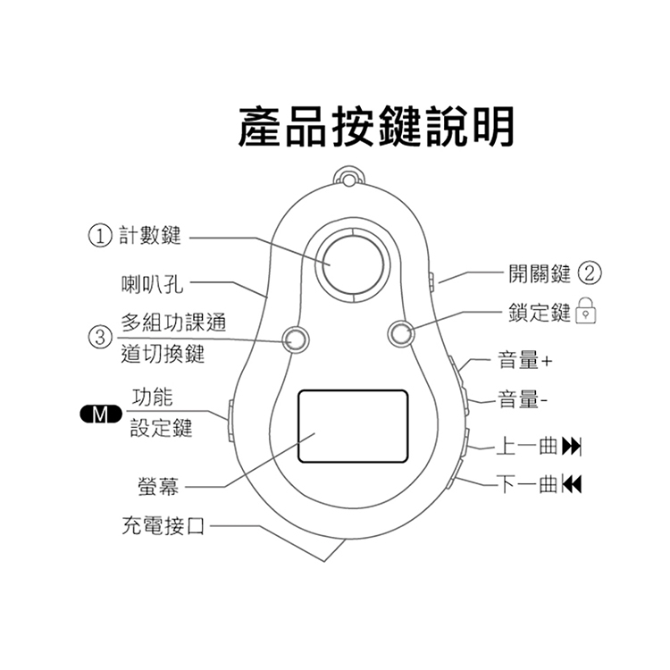 產品配件:念佛機*1、USB電源線*1(USB充電頭須另購)、說明書*1、掛繩*1