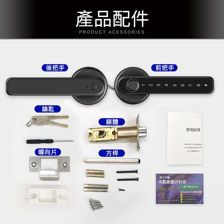 前後板對鎖螺絲(黑)x2/鎖體螺絲x4/螺絲起子x1/說明書x1/保固卡x1