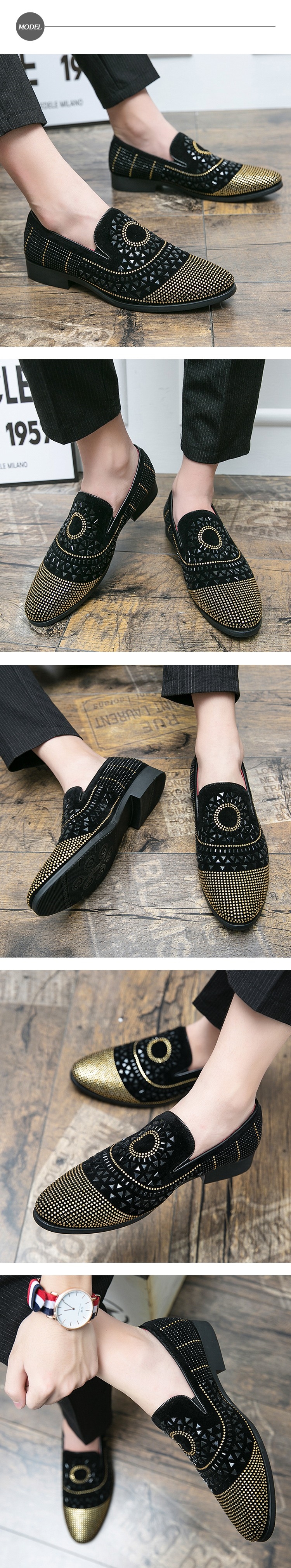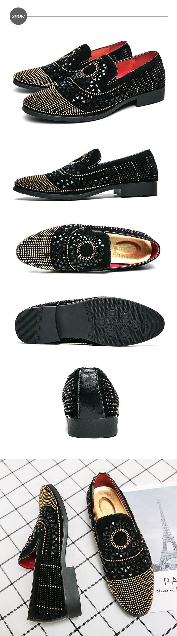 【Kiron】粗跟樂福鞋絨面樂福鞋/典雅絨面幾何太陽圖樣拼貼亮鑽潮流樂福鞋-男鞋 黑