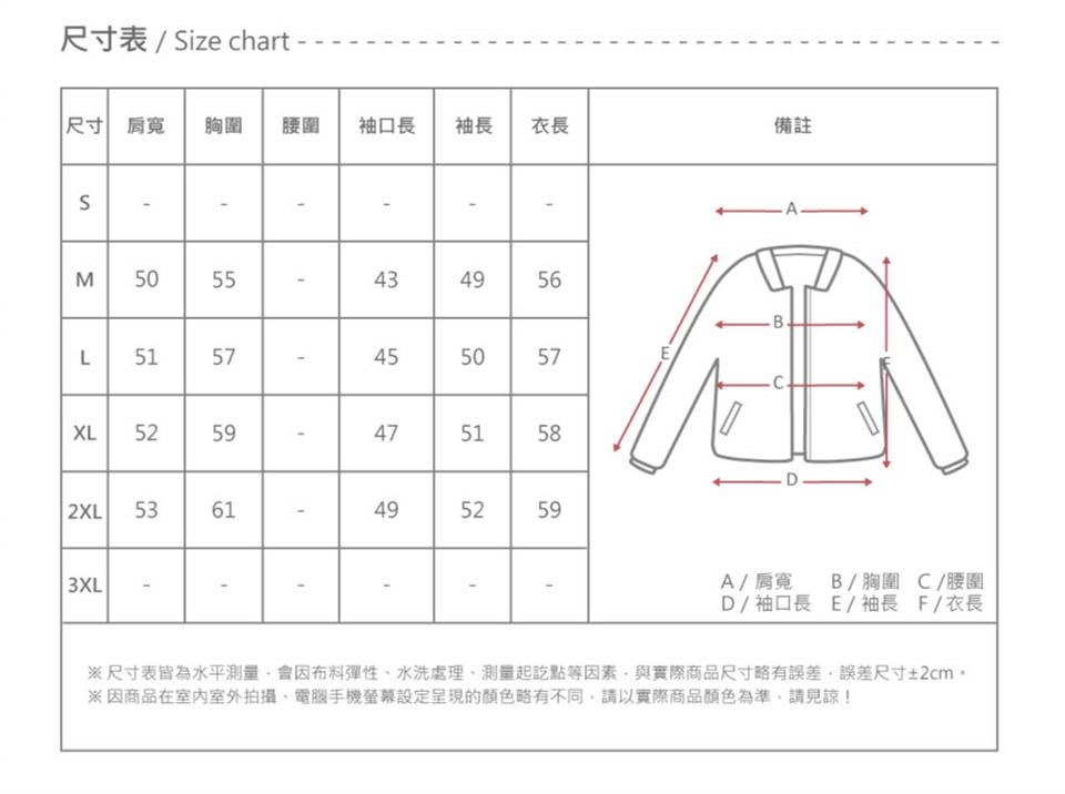 ※本尺寸表會因布料彈性、水洗處理、量測起訖點、人為拉扯等因素,與實際商品略有誤差。