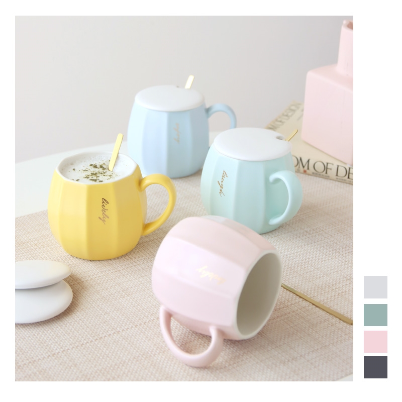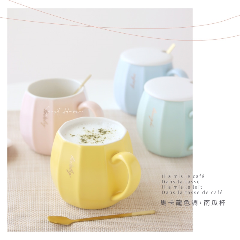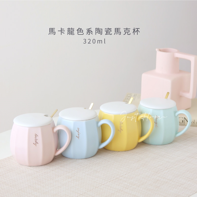 Just Home馬卡龍色系陶瓷馬克杯-320ml附杯蓋及湯匙(2件組)