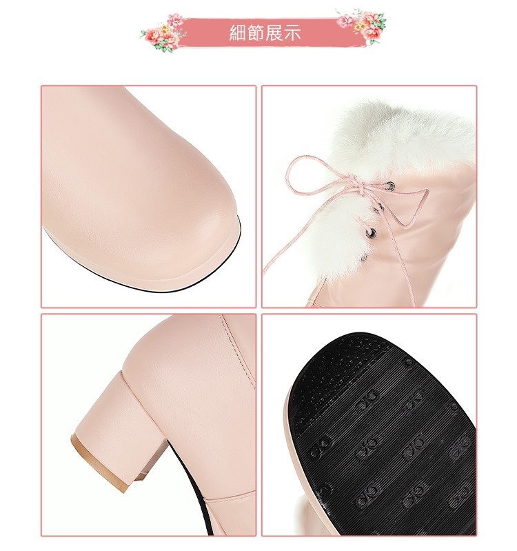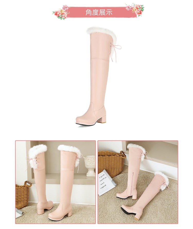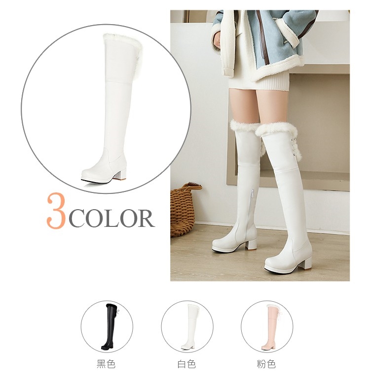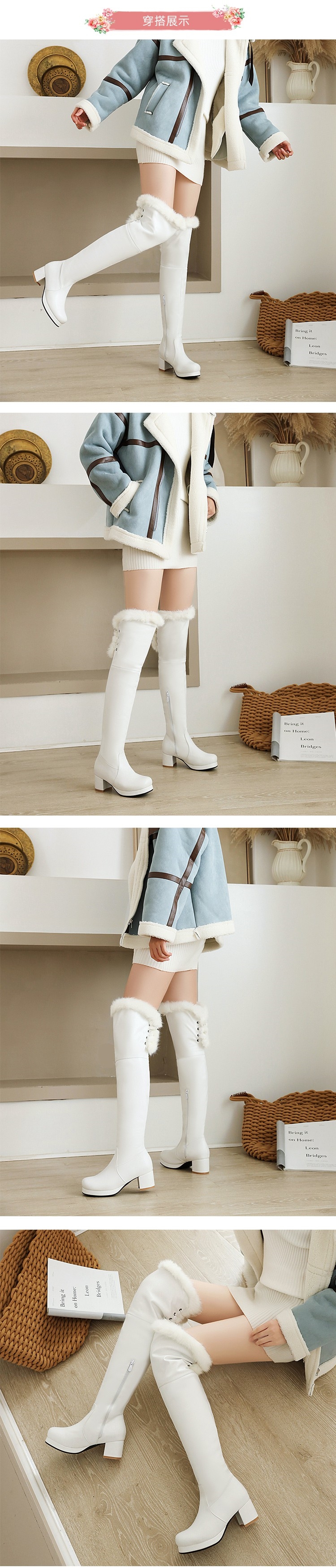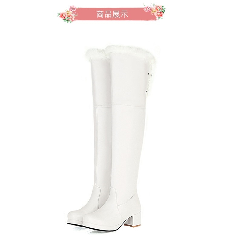 【Kissxxx】綁帶過膝靴粗跟過膝靴 /甜美毛絨靴口綁帶造型粗跟過膝長靴 白