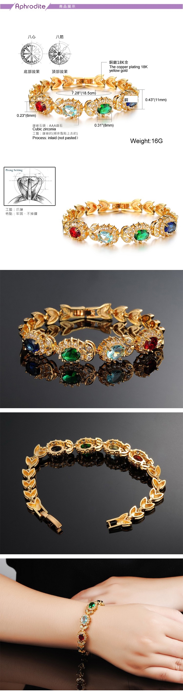 【Aphrodite 愛芙晶鑽】氣質典雅彩色水晶鋯石華麗美鑽造型手鍊
