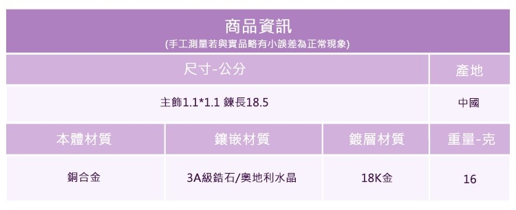 ◆合金飾品一經使用可能隨時間失去光澤或褪色,此為正常物理現象,妥善使用保存可延長飾品壽命。