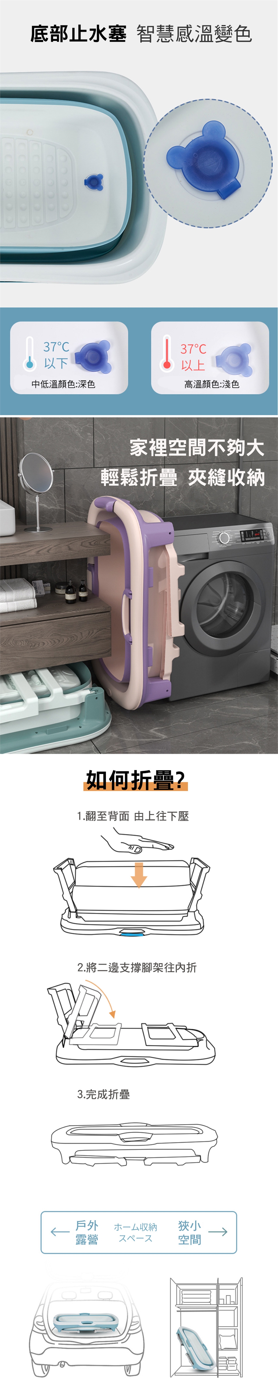 使用後:瀝乾後將泡澡桶壓回,再將雙邊支撐腳折回。