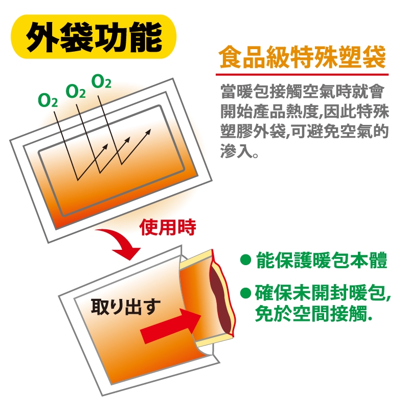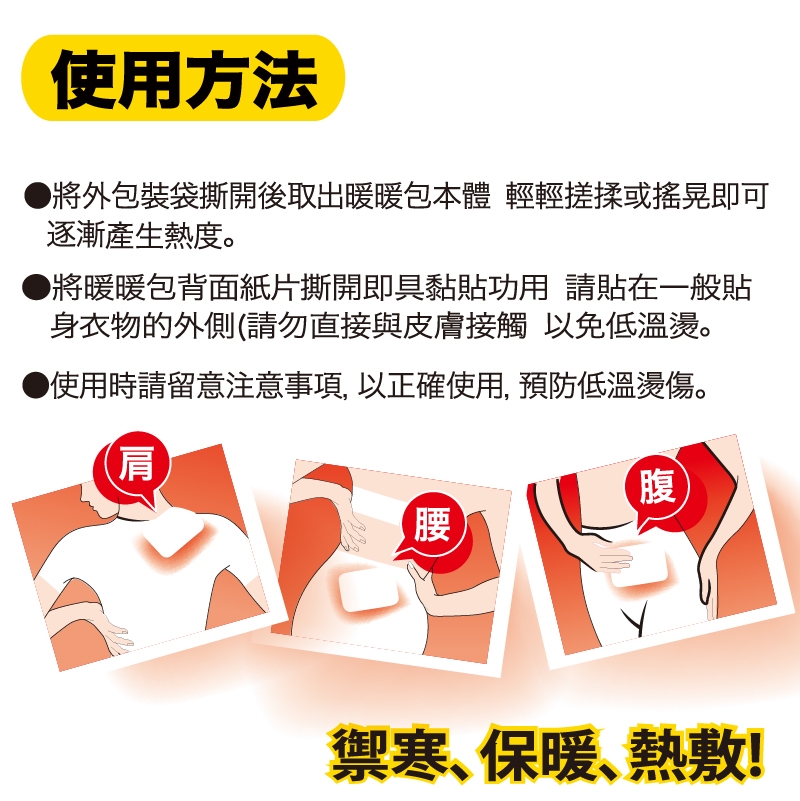 (1)將外包裝袋撕開後取出暖暖包本體,輕輕搓揉或搖晃即可逐漸產生熱度。