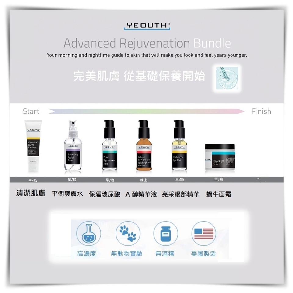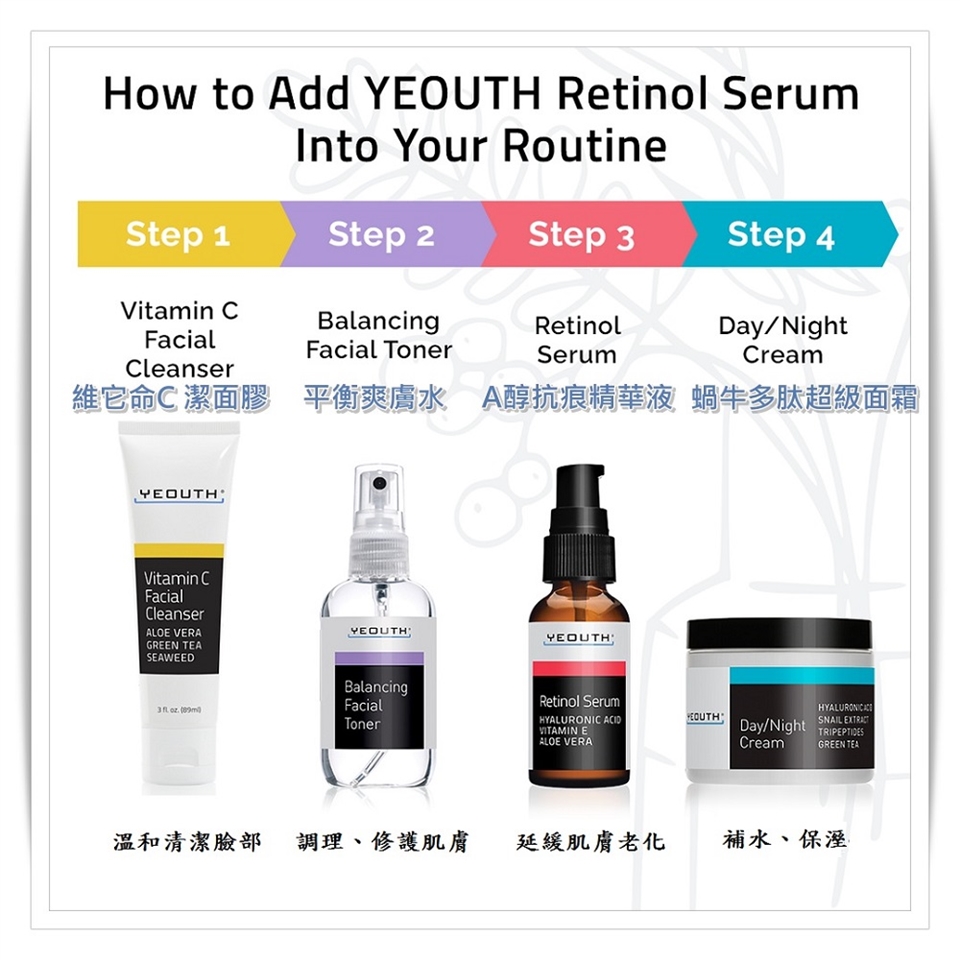 早晚使用。用 Yeouth 潔面乳潔面後,輕輕拍乾多餘水分。在臉上噴塗 Yeouth 平衡爽膚水。在肌膚變乾之前,取硬幣大小的日霜/晚霜塗抹於面部、頸部和肩部。輕輕打圈按摩至充分吸收。