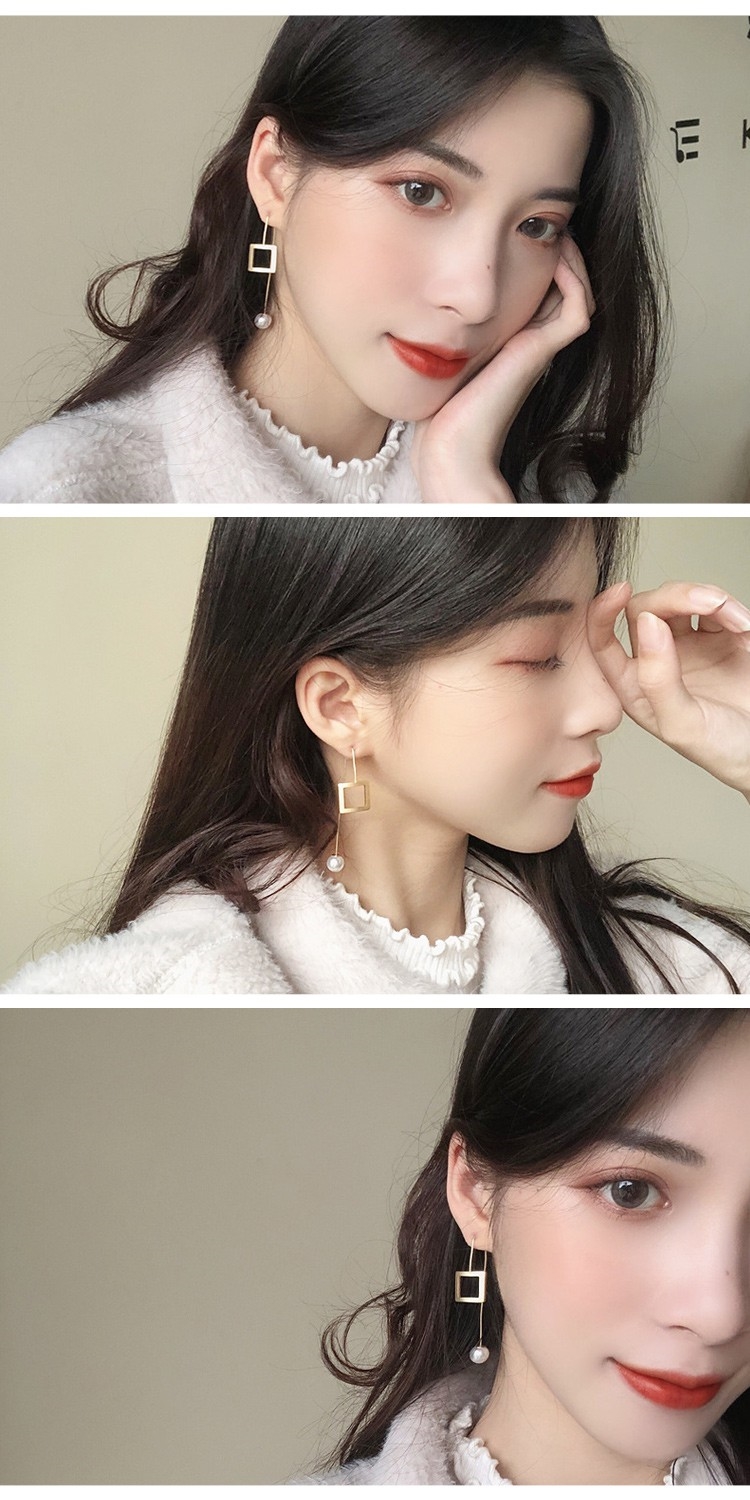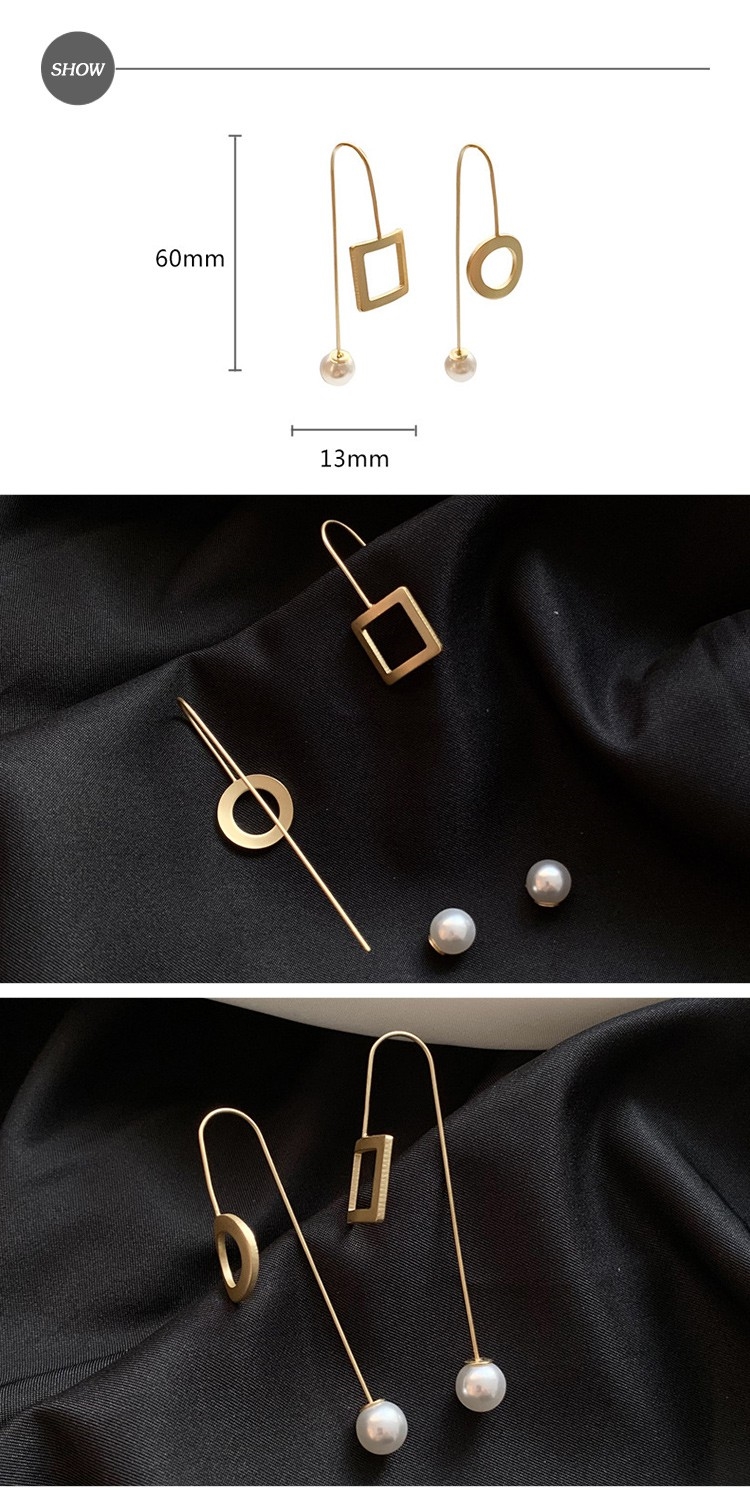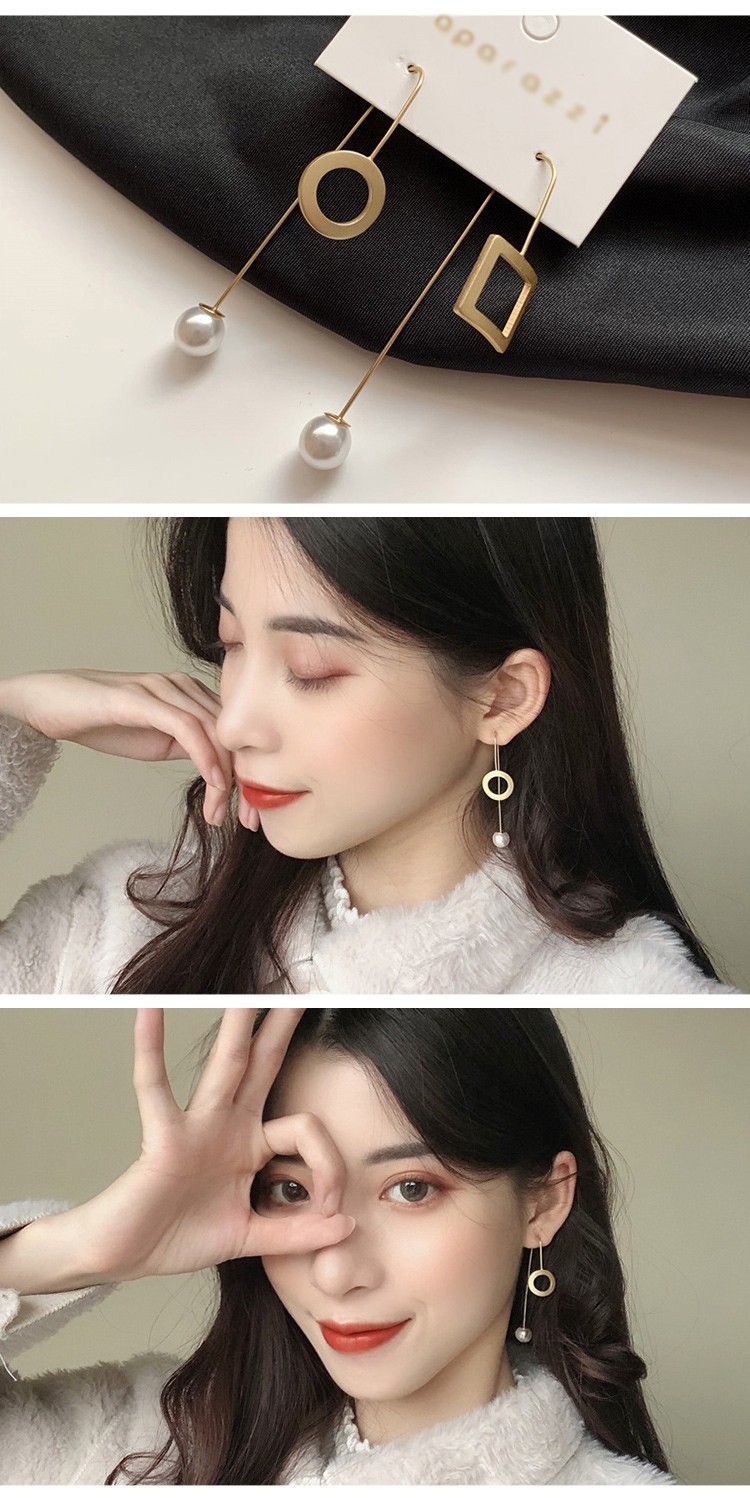 【INES】韓國設計金屬幾何形狀不對稱長款珍珠耳環