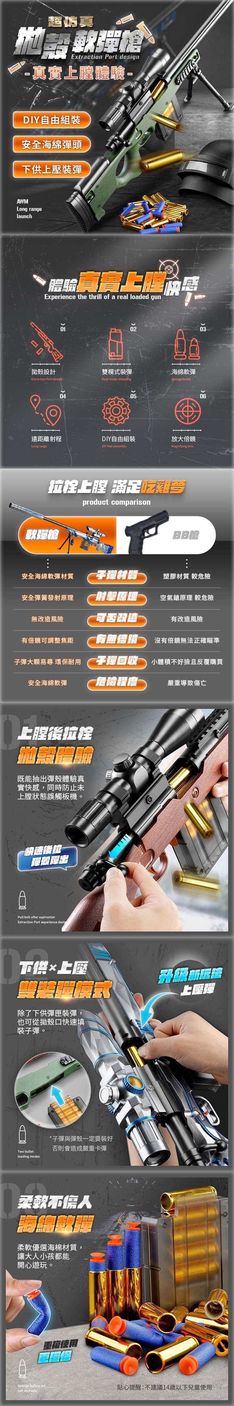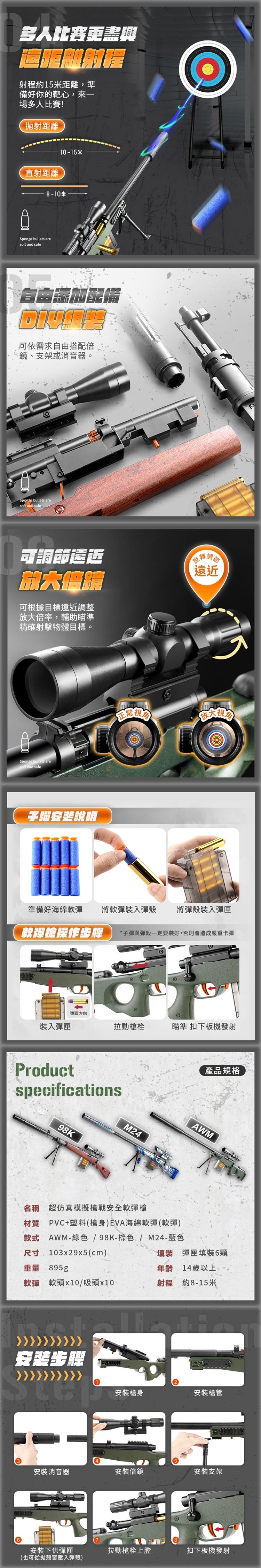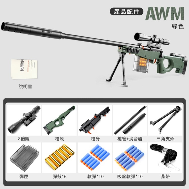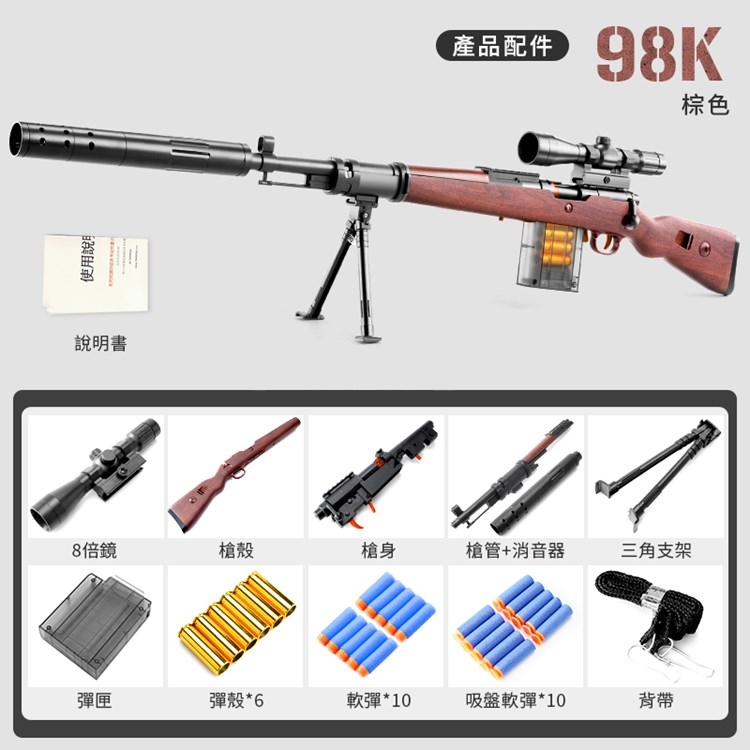 產品內容:槍身x1/槍殼x1/8倍鏡x1/槍管x1/消音器x1/三角支架x1/彈匣x1/彈殼x6/軟彈x10/吸盤軟彈x10/背帶x1/說明書x1