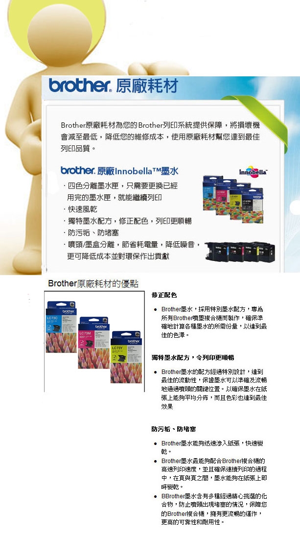 Brother 採用四色獨立墨水盒, 當一種顏色耗盡時, 更換該色墨盒即能填充, 更換過程十分簡易。