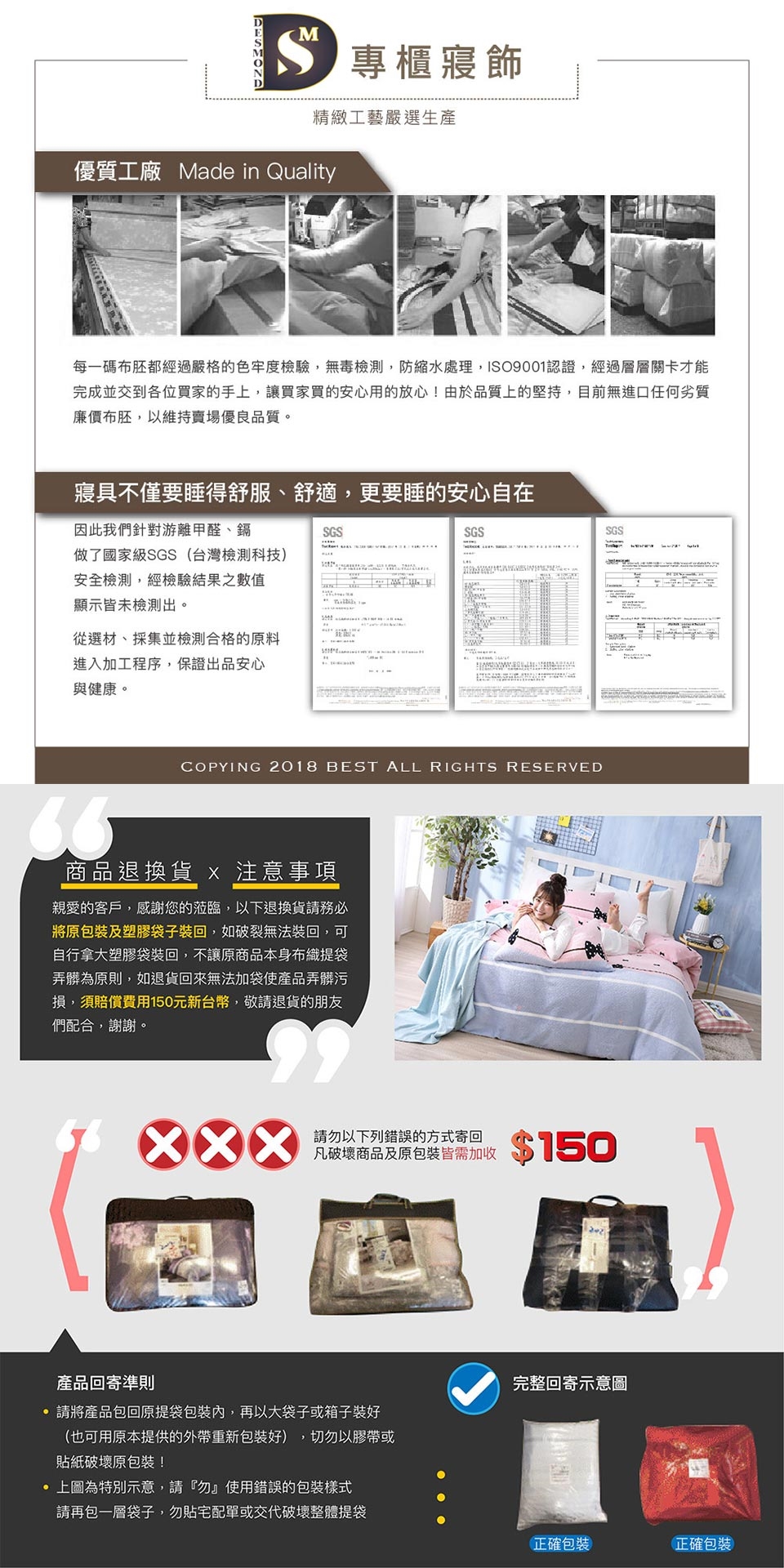 4.寢具商品屬為個人衛生用品,經使用或下水後,恕不接受退換貨