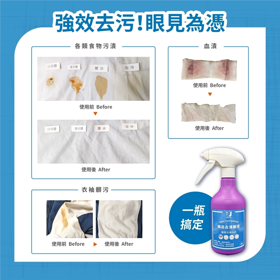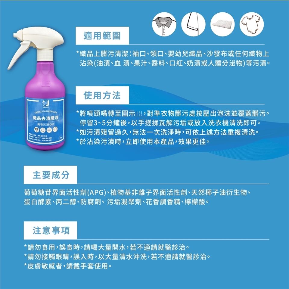 1.衣物沾濕前,距離污漬處約10公分噴灑,並停留5~10分鐘後,以手搓揉或放入洗衣機中清洗即可。