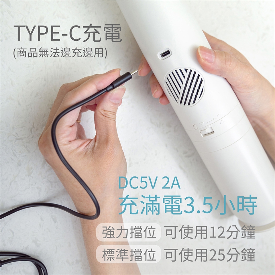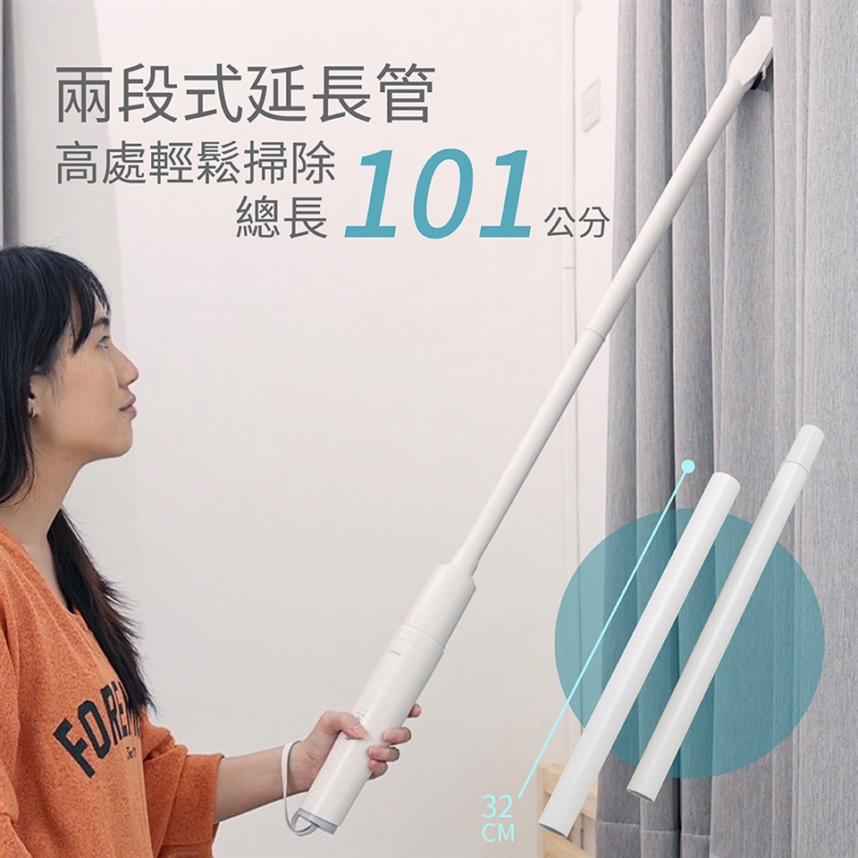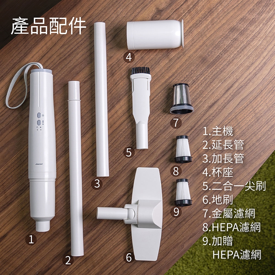 內容物:主機(含塵杯、HEPA濾網、金屬濾網、杯座)/充電線/延長管(兩節)/地刷/二合一尖刷/HEPA濾網