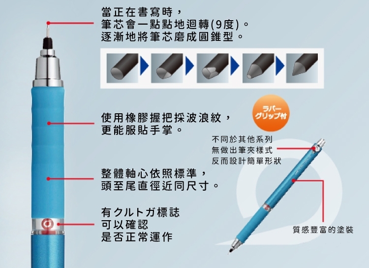 ●採用了波浪型橡膠握桿,除了握筆的舒適、服貼度以外,有增加摩擦力達一定止滑效果。