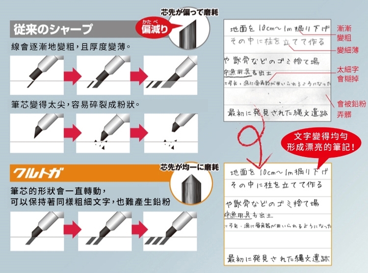 ※能維持筆芯書寫粗細,減少不必要的磨損,所以文字比較不易暈開(碳粉能以一定深度停留在紙張上);一般自動鉛筆書寫時,筆芯角度會越來越斜,因此文字深度會越來越淺(碳粉容易暈開),紙容易髒。