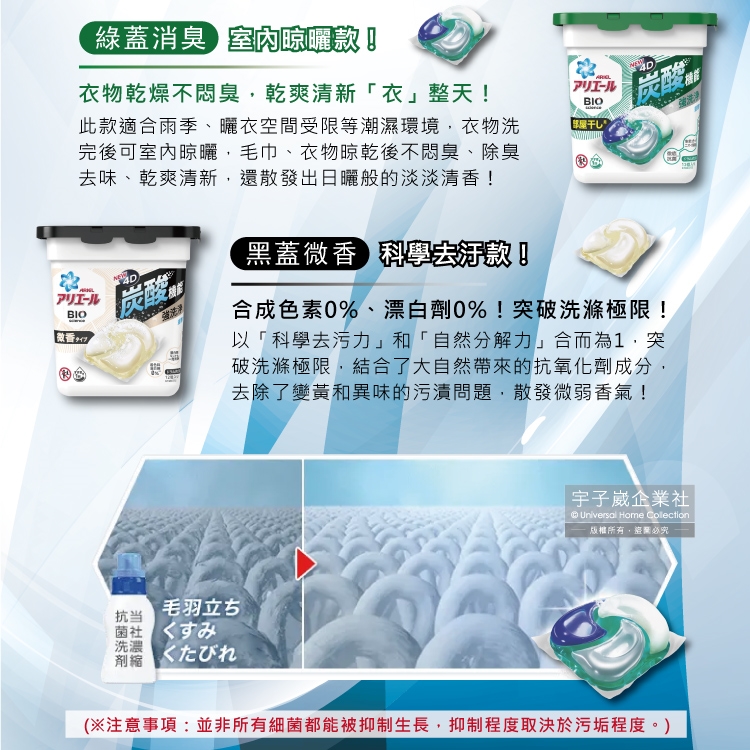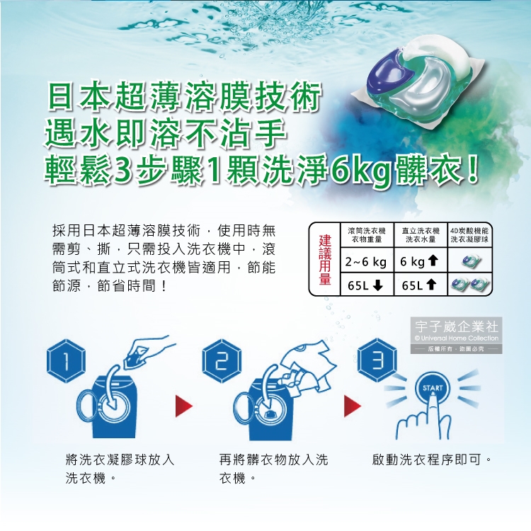 (1)洗衣量2~6 kg,水量未滿65L,使用1顆洗衣球。