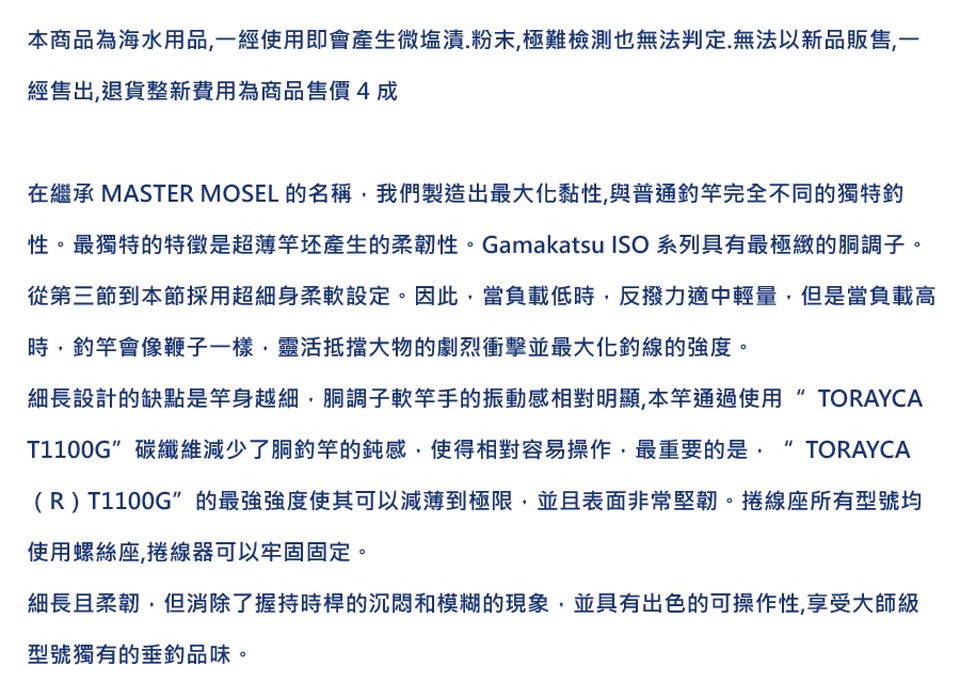 商品為海水用品,一經使用即會產生微鹽漬.粉末,無法以新品販售,一經售出,退貨整新費用為商品售價4成
