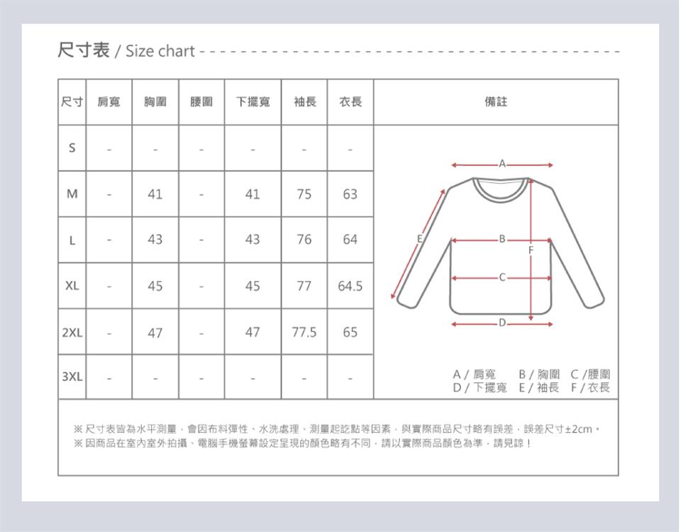 "※本尺寸表會因布料彈性、水洗處理、量測起訖點、人為拉扯等因素,與實際商品略有誤差。