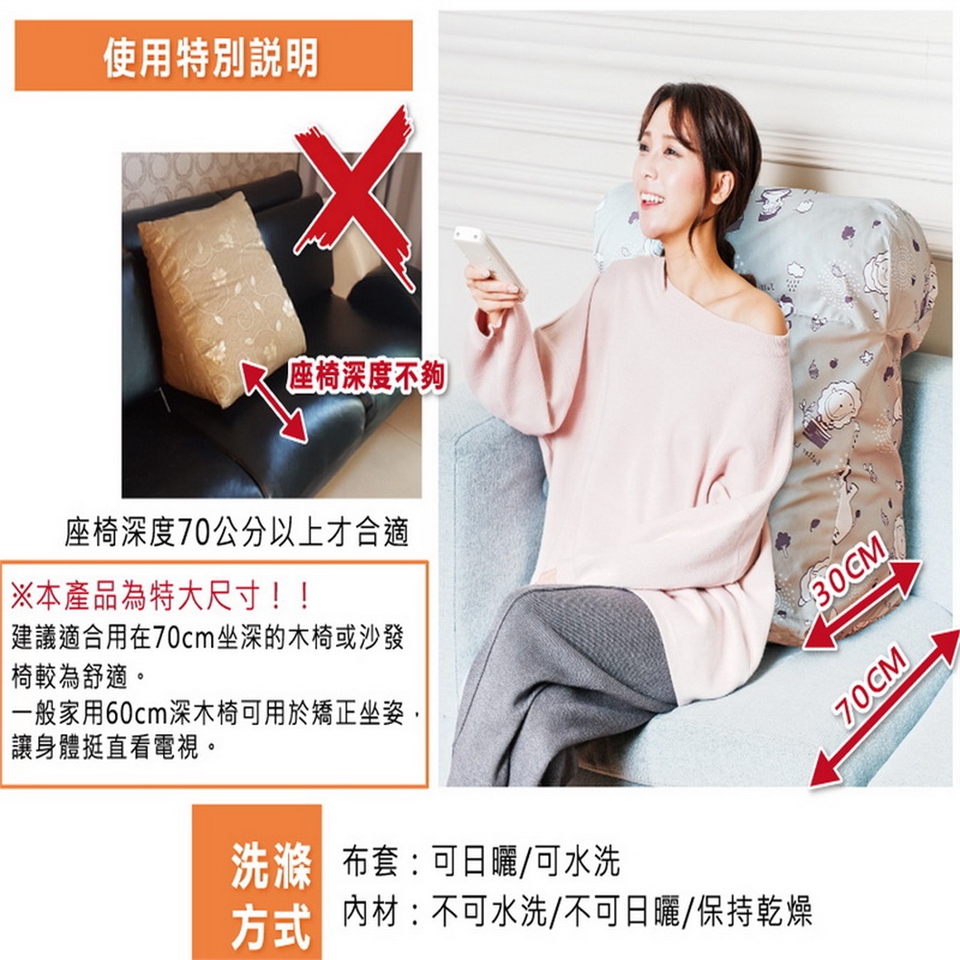【選購建議】※本產品底深約30Cm建議適合放置於70cm以上較深的木椅或沙發椅當腰靠枕較為舒適。