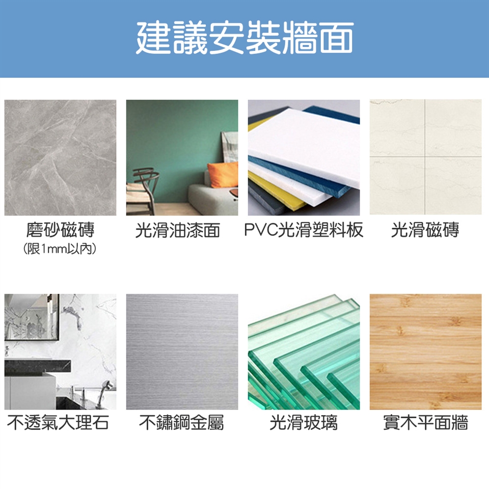 ✔️適合牆面:磨砂磁磚(限1mm以內)、光滑油漆面、PVC光滑塑料板、光滑磁磚、不透氣大理石、不鏽鋼金屬、光滑玻璃、實木平面牆...等