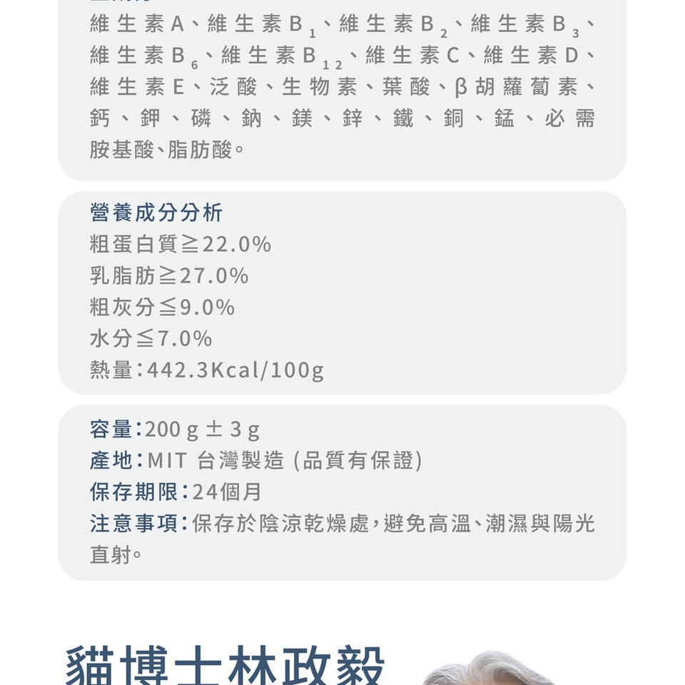 粗蛋白質≧22.0%,乳脂肪≧27.0%,粗灰份≦9.0%,水份 ≦.0%,熱量:442.3 Kcal/100 g。