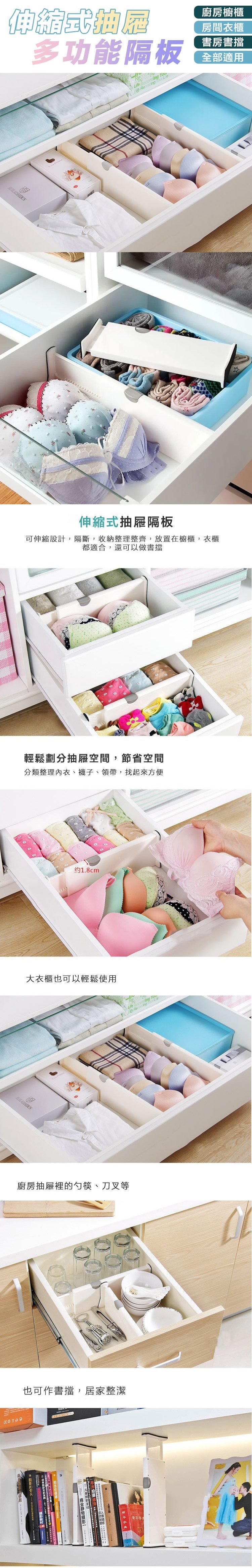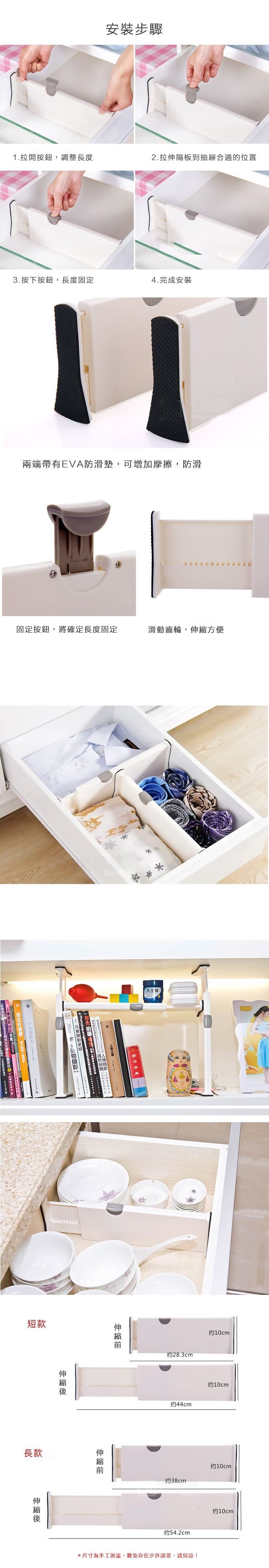 伸縮式抽屜多功能隔板 可以保持抽屜的條理整潔,每個隔板從27.5~43.5cm(短款) 37.5~53.5cm(長款)自由調節,上端卡扣保持固定,兩端防滑EVA,適合各種抽屜,無論是廚房裡的廚具、櫥櫃裡的襪子、書架上的分隔、客廳的矮櫃、臥房裡的化妝品等等都適用喔,使用靈活彈性