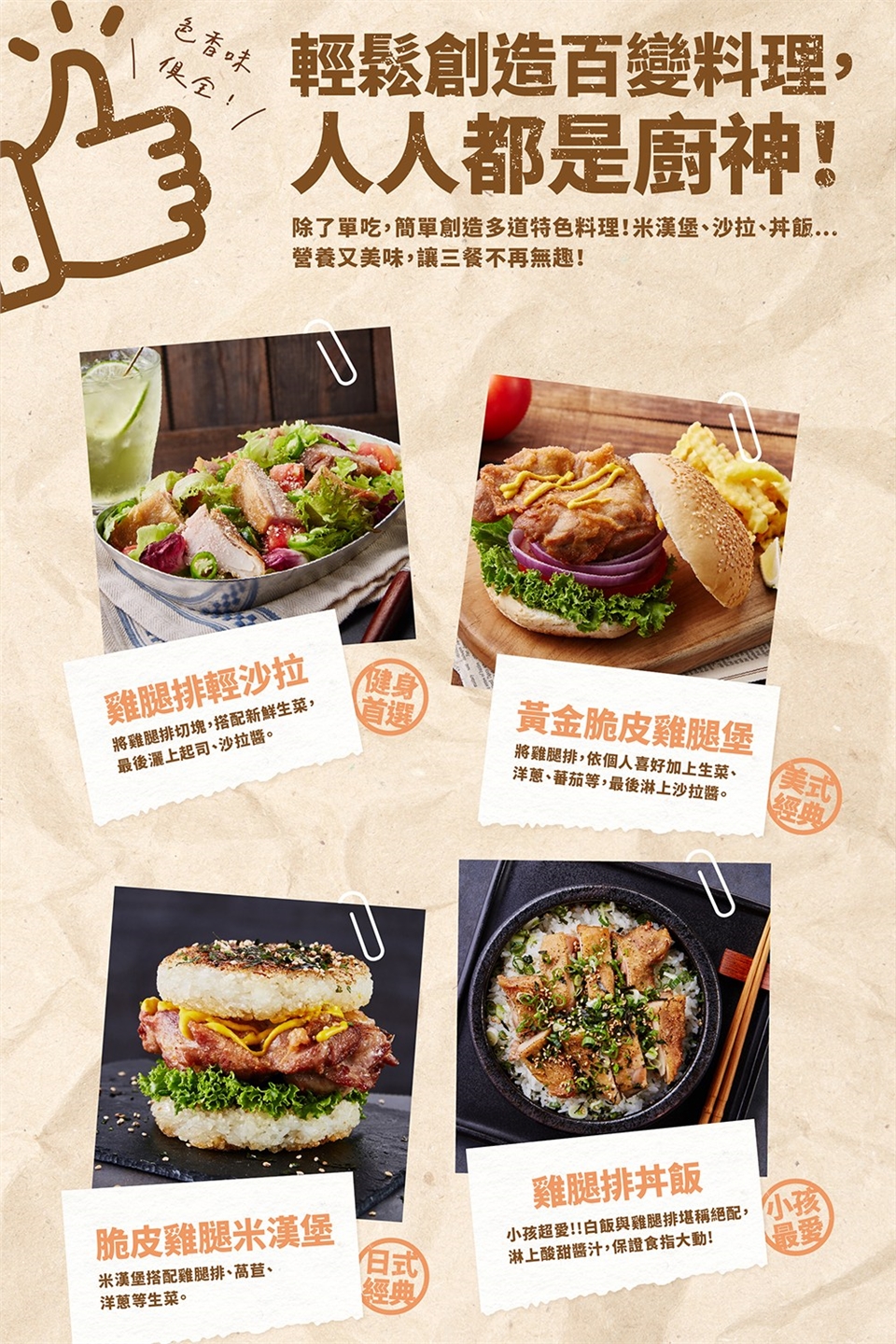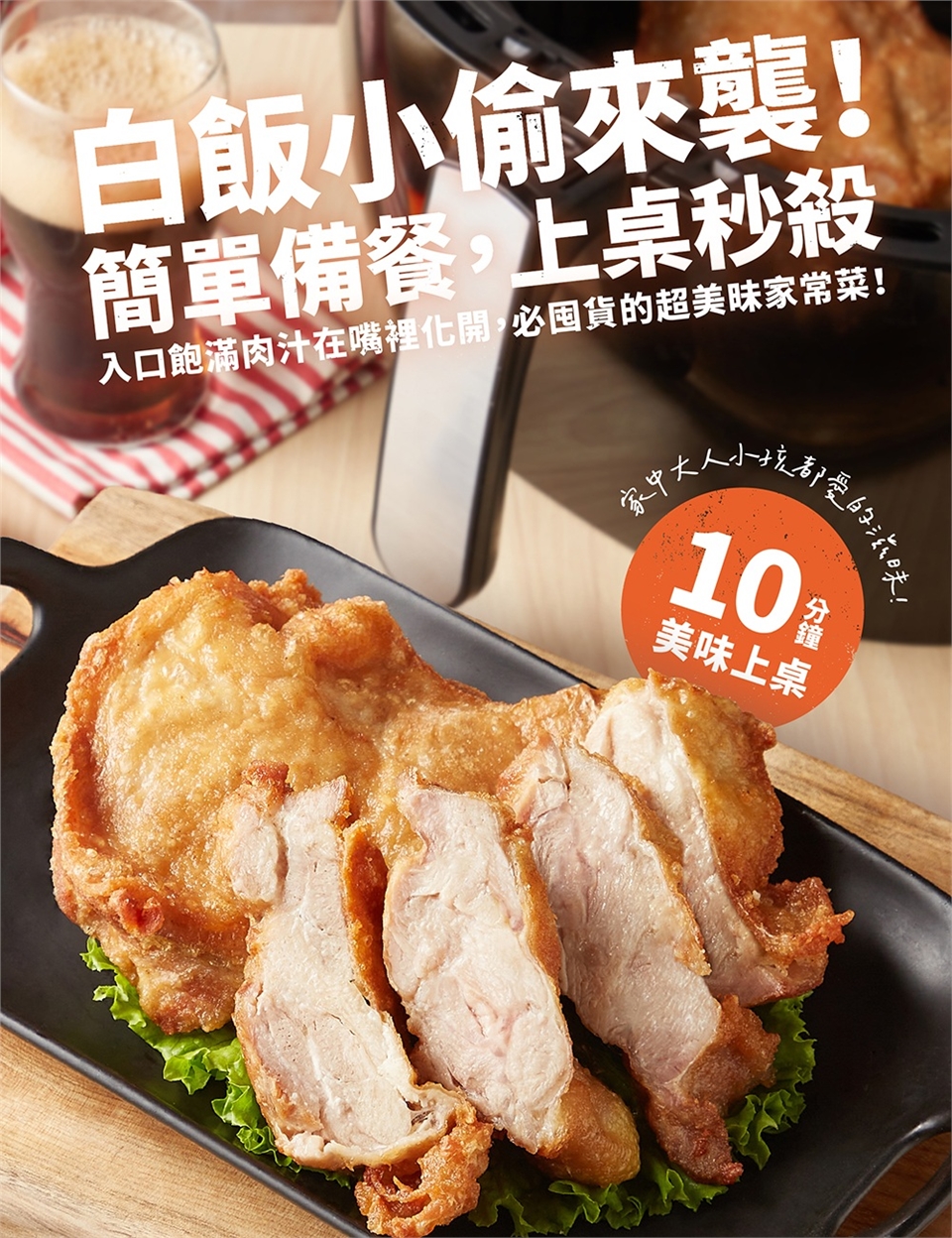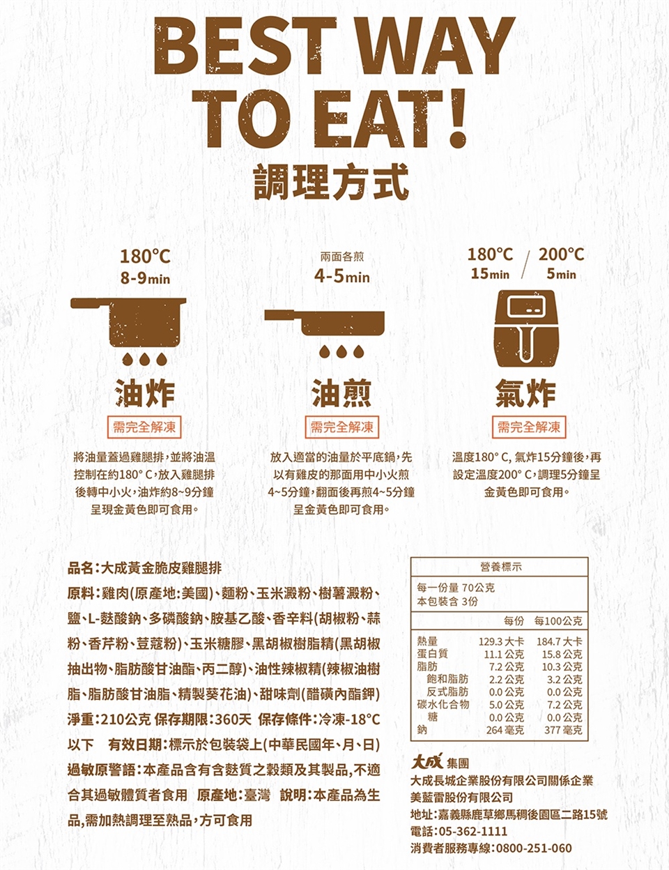 烹調方式:充分烹調加熱後即可食用,已調味裹粉,解凍後可使用氣炸鍋、烤箱、煎鍋。