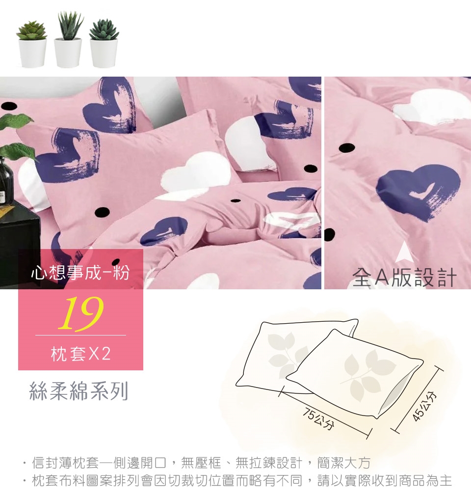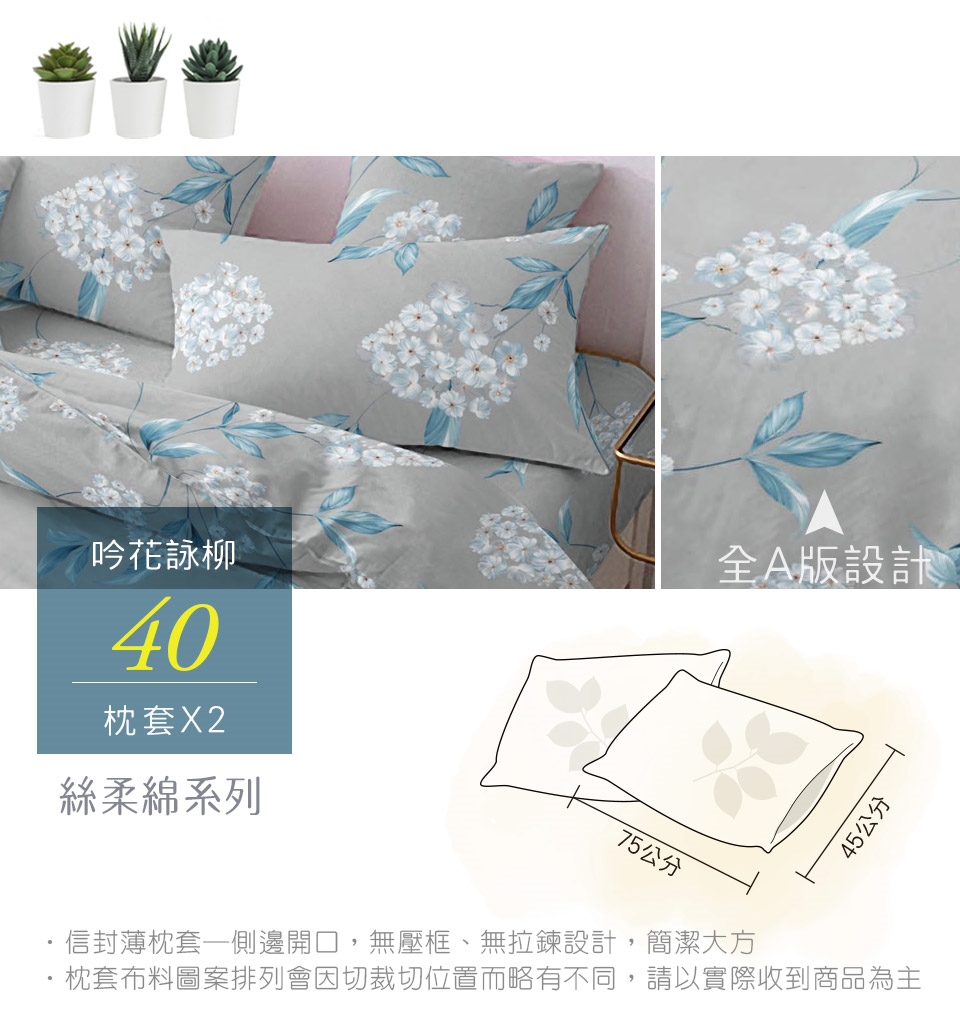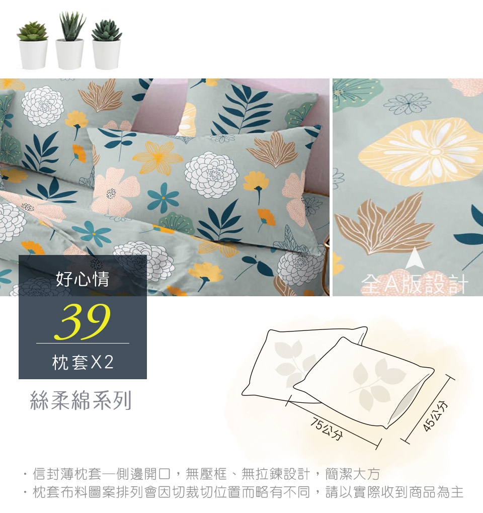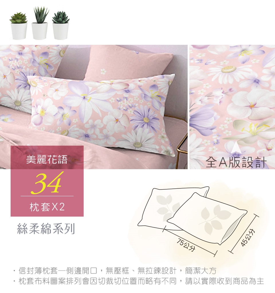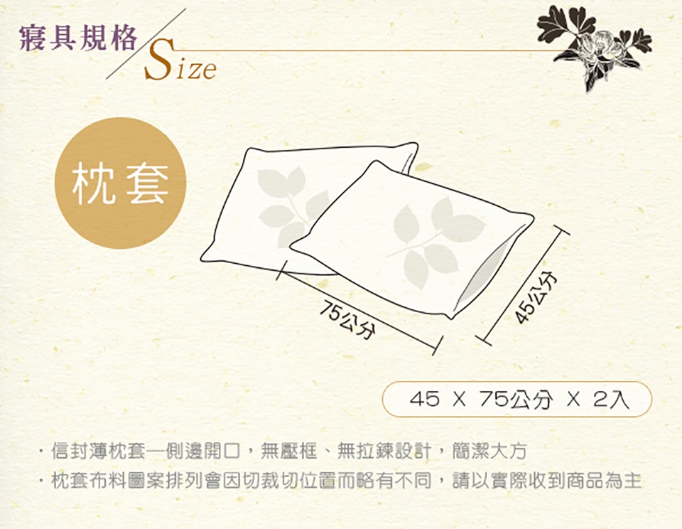 2. 枕套因裁切方式會有不同圖段不一定會與花色展示圖中一致,下單前請考量是否能接受此裁製方式。