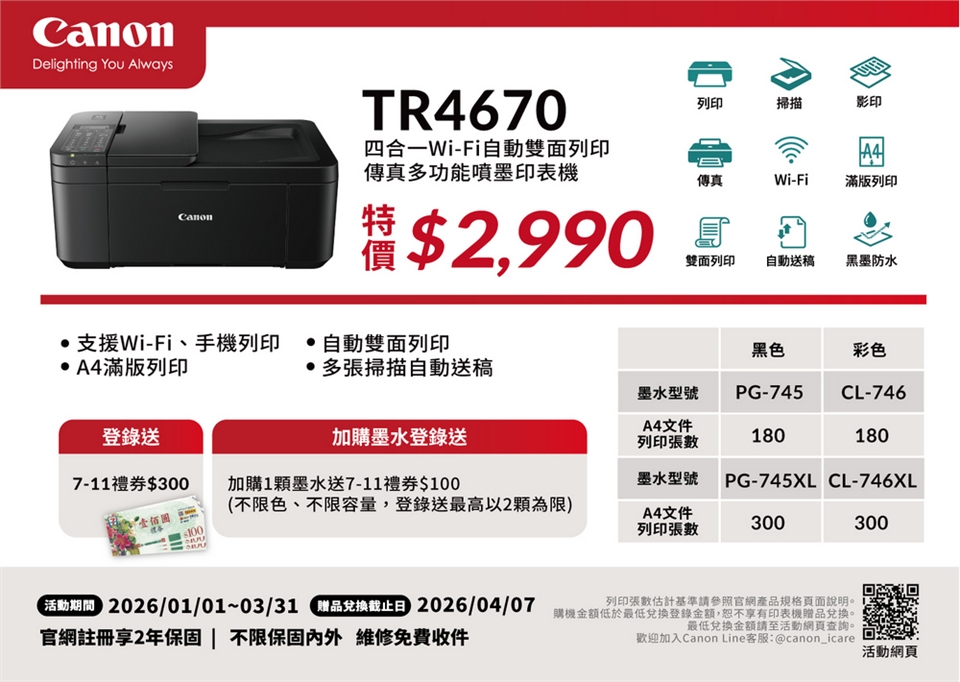 ★請注意:印表機購買金額若低於贈品最低登錄金額(詳見官網),恕不再適用原廠上網登錄送活動。