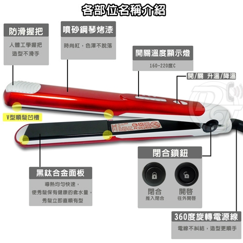 微控調整溫度直髮器。整髮造型簡單又快速 通過標檢局合格認證,許多髮廊指定使用,造型師專用的微控調溫直髮器,加溫快速, 還有4段式手動調溫,160-220度可調,可依照個人所需的習慣做調整, V型順髮凹槽,獨特的側邊斜角,造型時不容易夾髮,簡單使用容易上手; 面板採用黑鈦合金設計,導熱均勻快速,使秀髮保有健康的含水量,不流失水分, 秀髮立即直順有型,還有貼心的防滑人體工學握把,做造型時不會滑手喔! 貼心安全閉合鎖鈕,開啟或閉合都可以自行使用,收納時更加方便, 專業的360度旋轉電源線,電線不會糾結,且具安全閉合鎖,使用時更加安全。 |