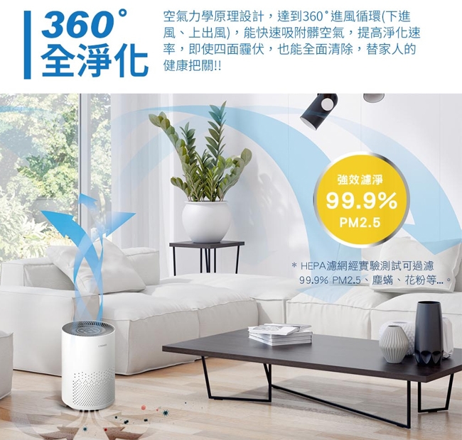 ◎採用空氣力學原理:360度進風設計,下進風、上出風,快速淨化空氣