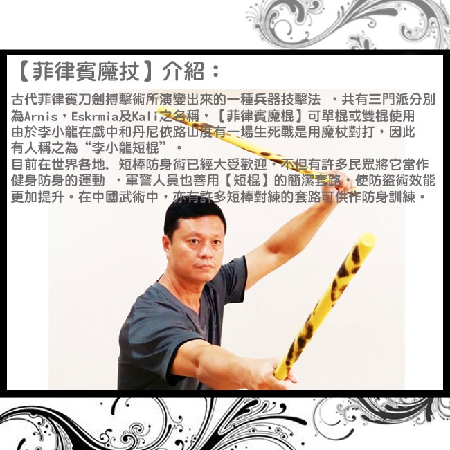 魔杖起源自南印度尼西亞,流傳於菲律賓,棍法變化無窮、出棍快速且有力,令敵人難以抵擋無法招架,短棒訓練是目前最簡易防身術當中最實用的工具,讓您輕易達到攻守兼備效果。