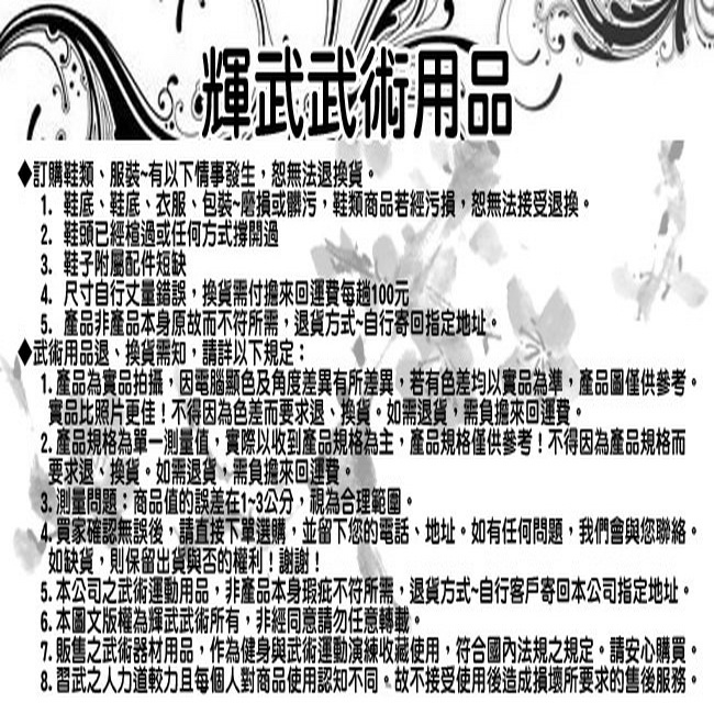 備註:武術用品,因習武人的力道不同,且對商品使用的方式與認知不同,商品僅供鑑賞不供試用。如經使用後所造成的損壞,則無售後維修換貨之服務。購買後,請確認商品規格與材質為適合自身使用後在作使用。一經使用,則不接受退換貨。