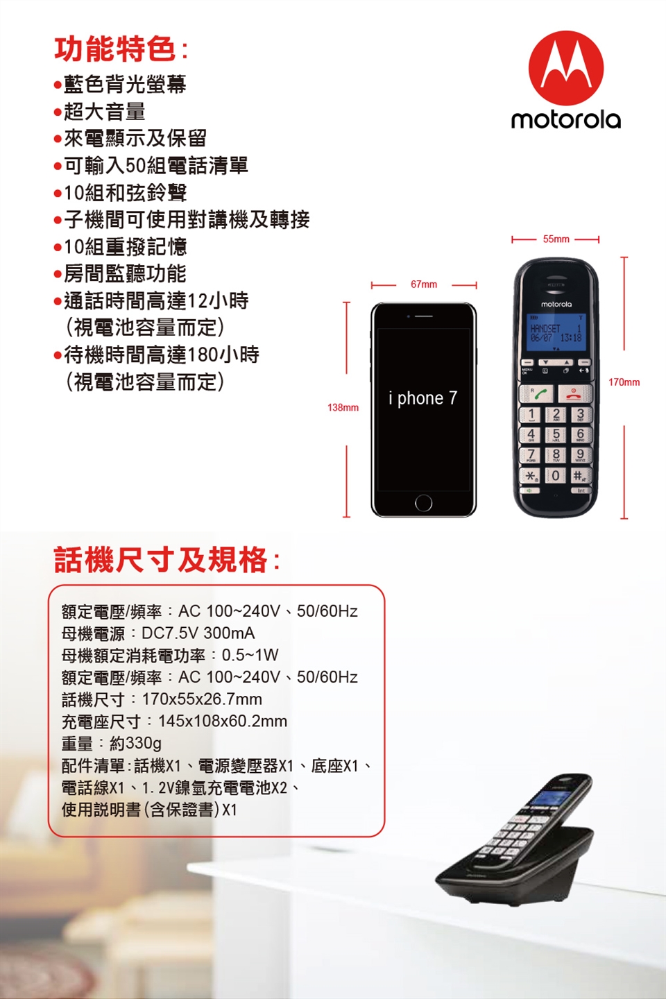 配件 話機1,電源變壓器1,電話線1,1.2V鎳氫充電電池2,使用說明書(含保證書)1