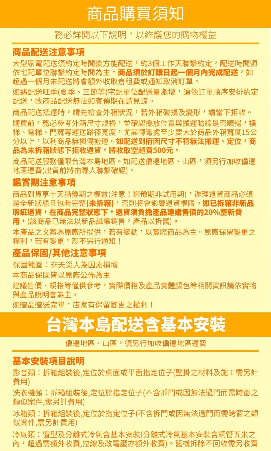 本商品含基本安裝(免樓層,免安裝定位費,搬運動線需順暢,樓梯、電梯、門寬等運送路徑寬度,尤其轉彎處至少要大於商品外箱寬度15公分以上。廢四機免費回收,但額外施工之材料及施工費另計)