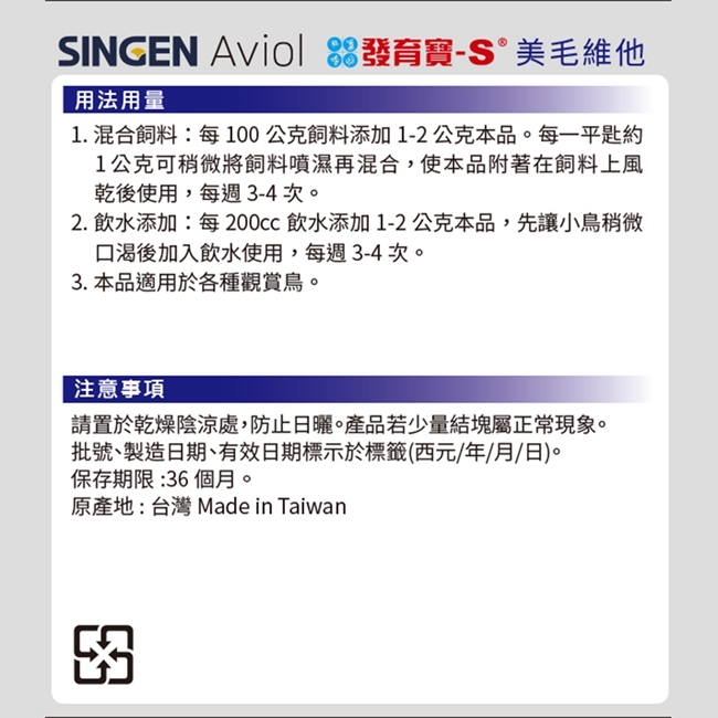 2.飲水添加:每200cc飲水添加2公克本品,先讓小鸟