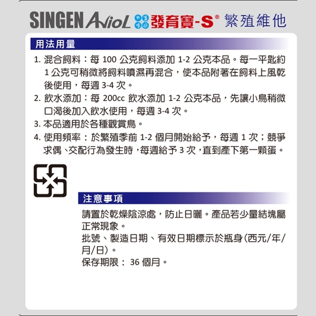 使用頻率:於繁殖季前1-2個月開始給予,每周1次;