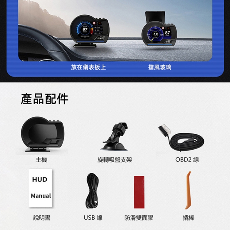 .產品內容:主機×1、OBD2線×1、雙面膠×1、吸盤支架×1、螺絲起子×1、撬棒×1、使用說明書×1