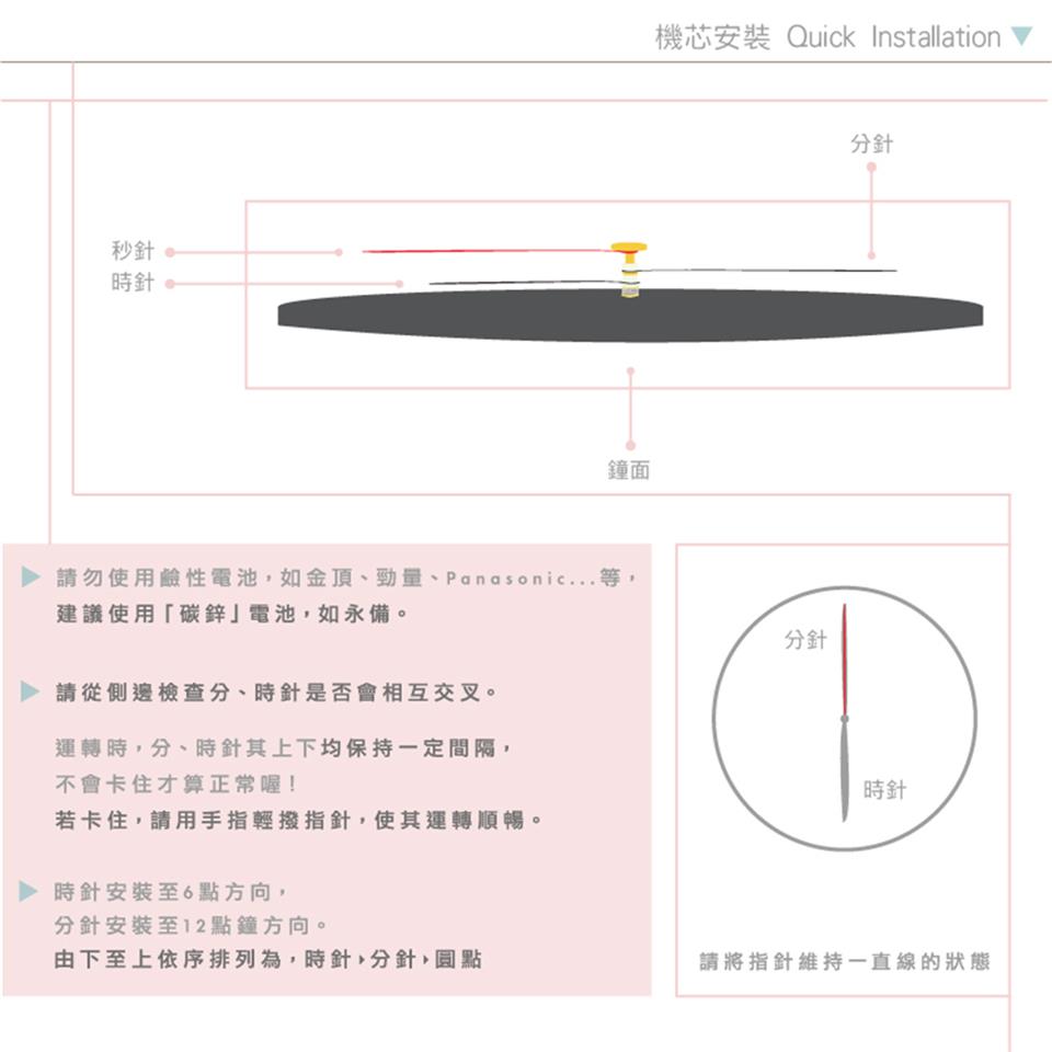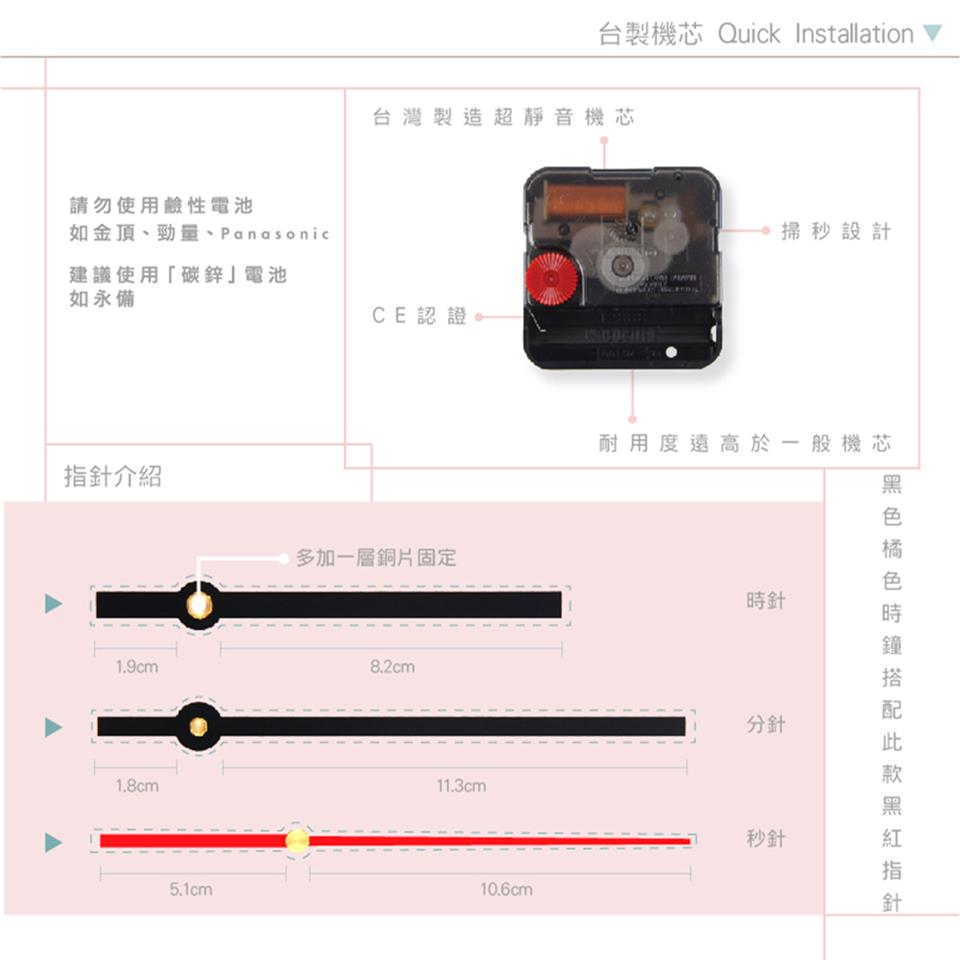 機芯:台製超靜音掃秒機芯,背蓋另有螺絲孔洞可用吊掛方式懸掛