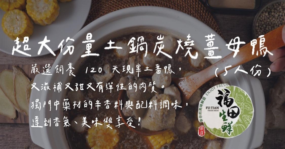 冬天到了,氣溫降低,這時候令人最想吃的美食,當然就是薑母鴨。嚴選飼養 120 天現宰土番鴨,正值青壯年的大公鴨入鍋,滋補功效及又甜又有彈性的肉質。先以黑生鐵鍋麻油老薑片爆炒鴨肉1小時。再以傳統土鍋炭燒、燜燉6小時而成,獨門中藥材的辛香料與配料調味,達到香氣、美味雙享受!入酒提味,久燉而沒有辛辣酒味,大人小孩都非常適合食用。