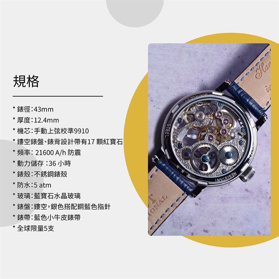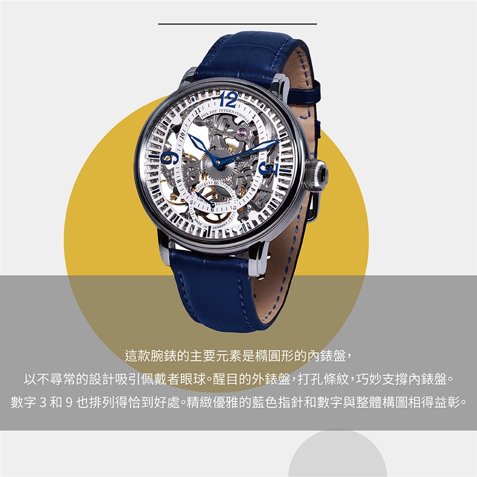 “Skeleton Earl Orloff”錶款在機芯和錶盤上採用精美的鏤空設計,看似專為貴族打造,但這種美卻是人人皆可享用的。這款腕錶的主要元素是橢圓形的內錶盤,以不尋常的設計吸引佩戴者眼球。醒目的外錶盤,打孔條紋,巧妙支撐內錶盤。數字 3 和 9 也排列得恰到好處。精緻優雅的藍色指針和數字與整體構圖相得益彰。